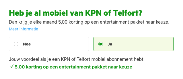 Geef aan of je al mobiele telefonie van KPN of Telfort hebt. Als dit het geval is ontvang je €5,00 korting per maand op een entertainment pakket naar keuzestap 1 - ben je al klant kpn telfort